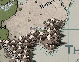 Boroftkrah is located at the southern edge of the Rime Plains and at the base of the eastern Dunrock Mountains. It has a large population of orcs and half-orcs, who survive by hunting on the Rime Plains[2] and are distinguished by their rejection of Gruumsh and their dedication to Kord.[3]