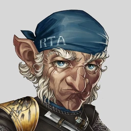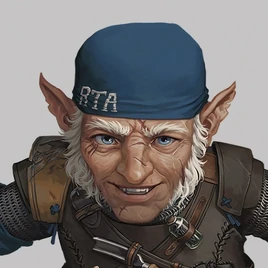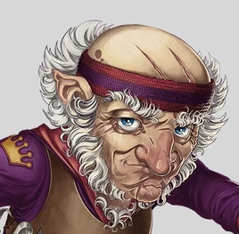 Chetney is an elderly gnome who appears to be "a hundred-and-something" years old, with blue eyes, several scars, and a hooked nose that he says has been broken more than once.[22] He stands about 3 foot 4 inches and has well-muscled arms. On his right arm is a tattoo of a crown and the letters "RTA", which stand for "Rexxentrum Toy Authority" (a mark required by his former union),[23] though he tells people it stands for "Recognize The Alpha".[24] Tufts of silvery-grey hair sprout from and over his ears from under a knitted cap with ear straps pulled down tight on his head; he is partially bald, and the remaining hair has gone completely silver as well. He originally wore a leather chest harness, pointy-toed boots, and woodworking tools around his waist.[25] While aboard the Crimson Abyss, he acquired a flaming bell tattoo on his butt cheek.[26] Just before the group traveled to Eiselcross, he bought a new leather fur-lined suit with some chainmail accents and a shoulder pauldron crafted from a piece of FCG's body, fingerless gloves, and a blue bandana embroidered "RTA", had his toolbelt turned into a bandolier, and hung the Harp of Valor from a leather strap at his waist.[27]