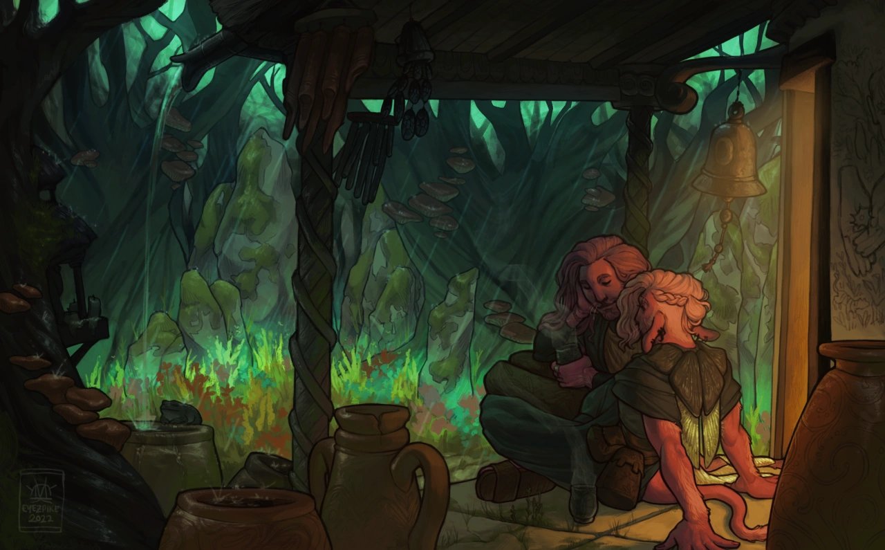 - ↑ Fan art of Caduceus and Calliope in the Blooming Grove, by eyezpike (source). Used with permission.