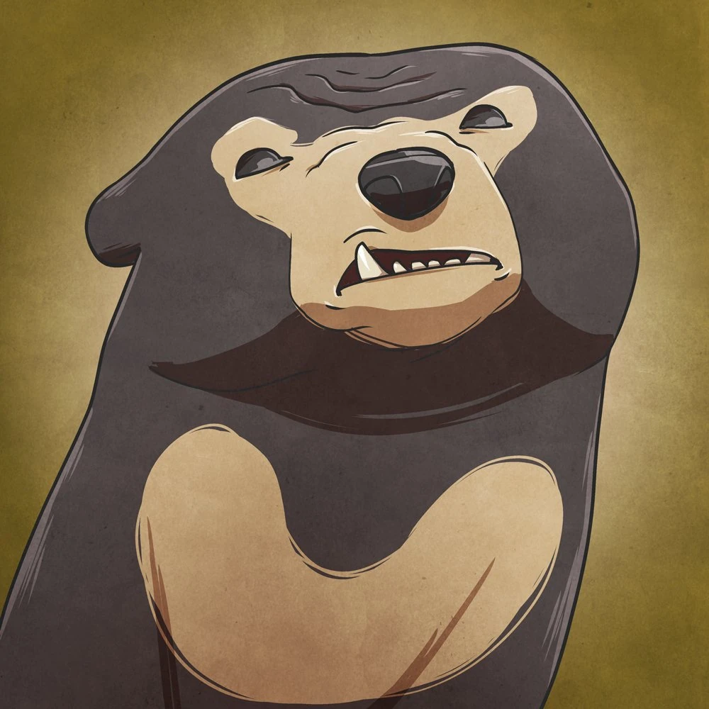 Like his brother, Cookie is depicted as a large Sun Bear; though similar to a Black Bear, the difference can be seen through the brown face as well as the large spot of brown highlighting the neck. His mouth usually hangs open, often exposing his lower right fang.