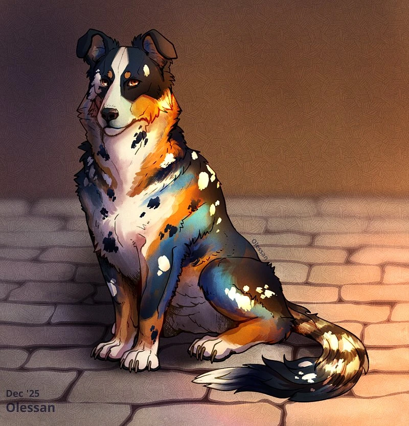 Morgaine is a beautiful mountain herding dog similar to a collie with black, white, and brown fur in splotches, as well as an unusual shade of deep, rich blue.[3]