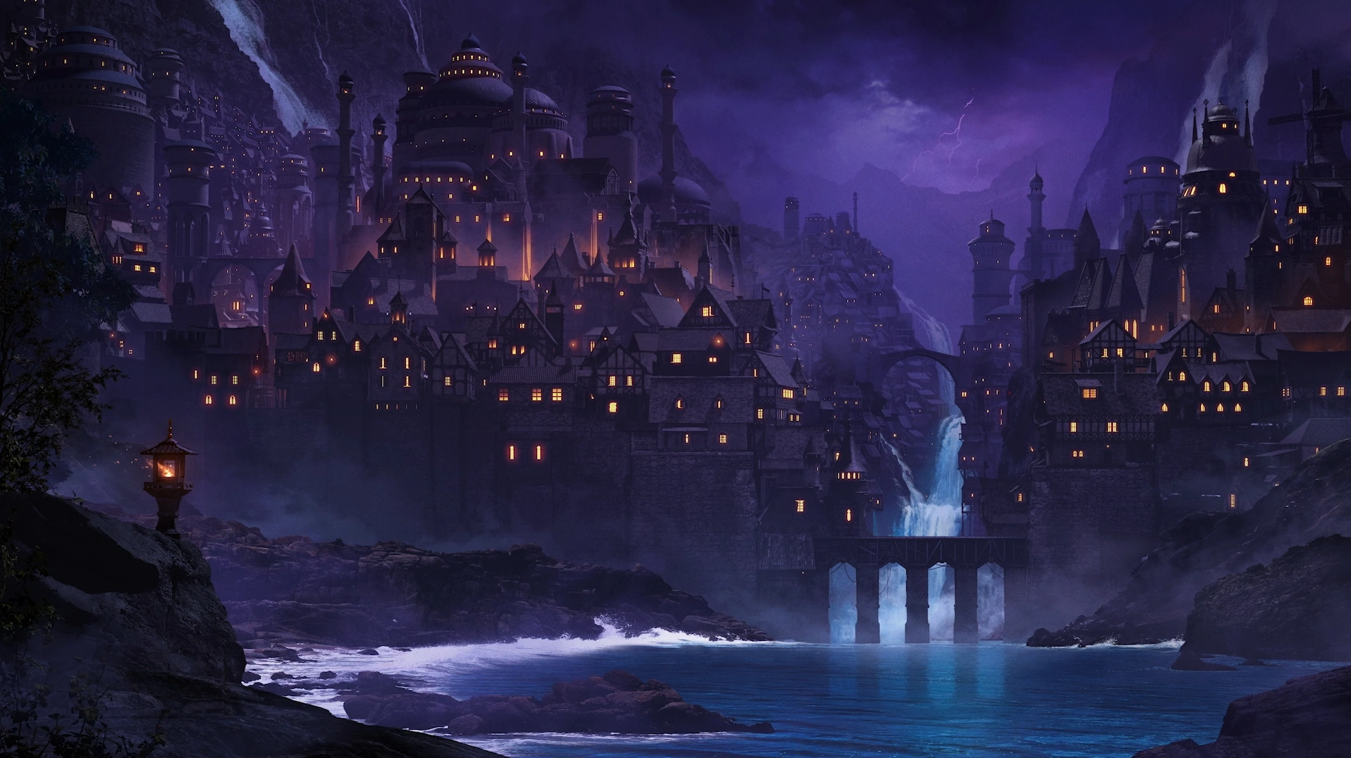 Often hit by rain and thunderstorms,[5][6] Dol-Makjar is a city of gray stone and towering spires. The River Vrosh runs down from the mountains of Kavros, stepwise, along the eastern edge of the city,[1] and turns into waterfalls once out of the city and into Lake Nahami.[7]