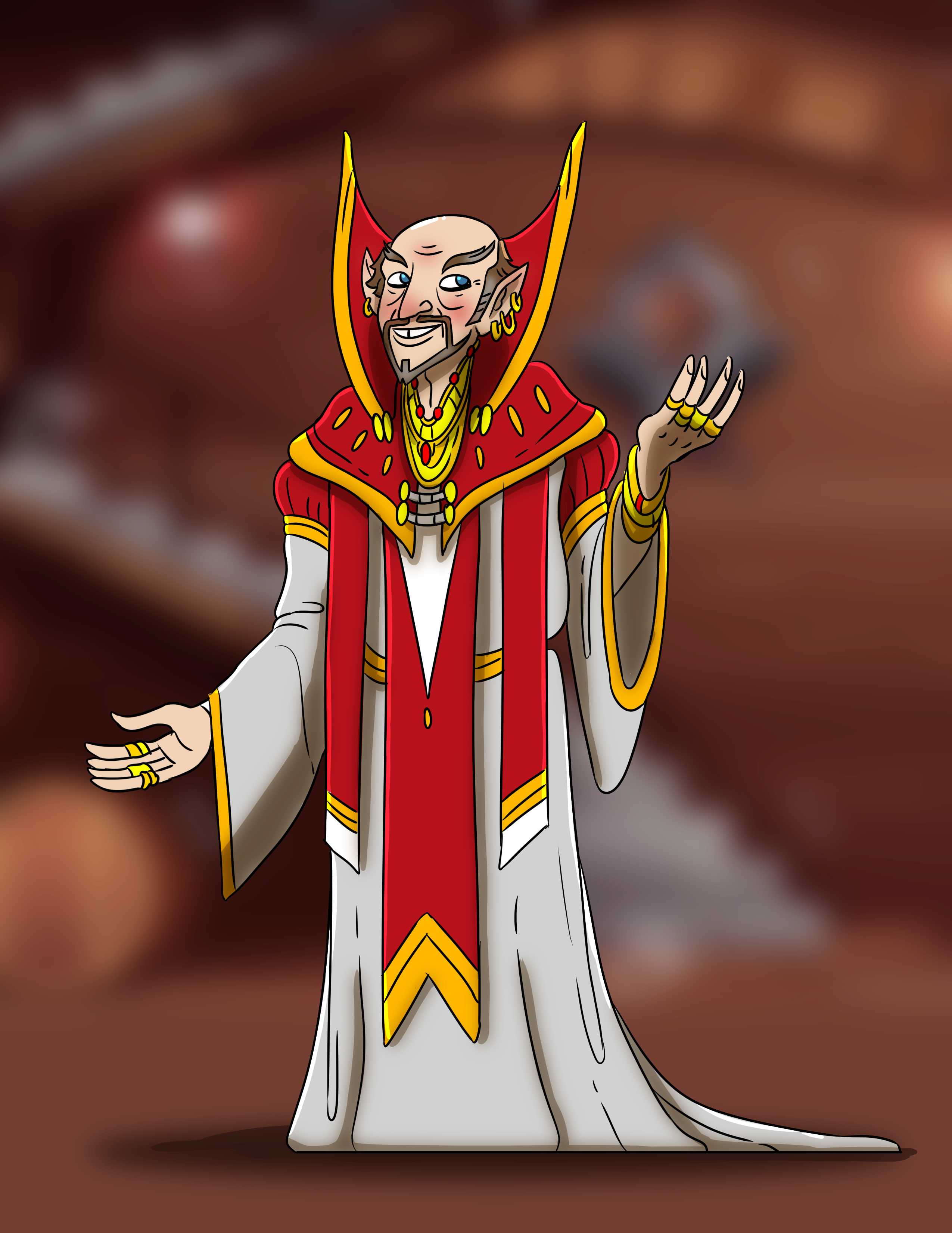 Evon is an older male half-elf. He is tall and very thin, and is described as "spider-like".[4] When Bells Hells first met him, he wore a red and gold mantle with a raised area behind his neck that came to points past his shoulders.[5] Below the mantle, he wore a silver robe and a considerable amount of jewelry. His hair was worn in well-kept sideburns which were going gray, and he had a pencil mustache extending down into a thin horseshoe mustache. His eyebrows were thick and pointed up at the outer edges.[6]