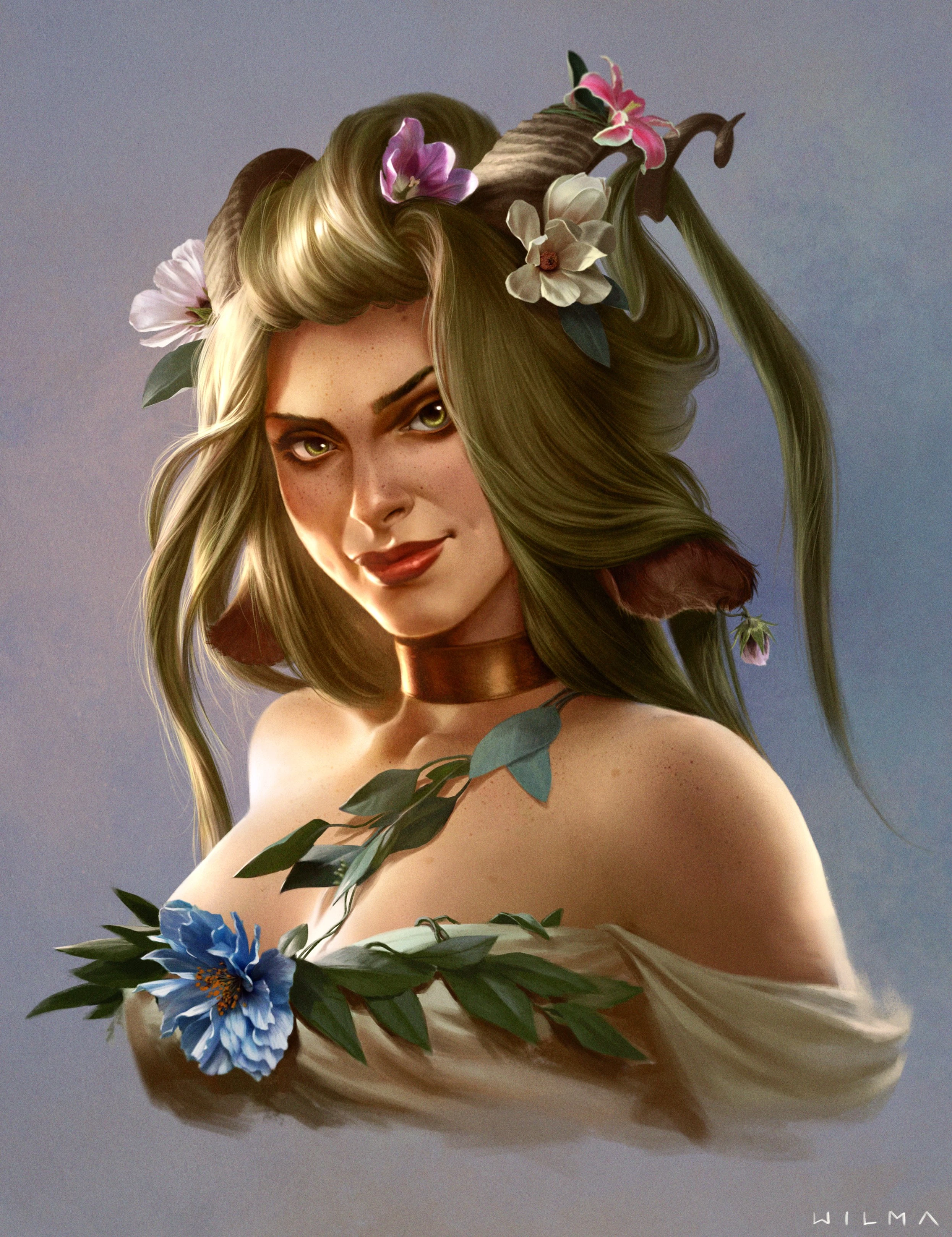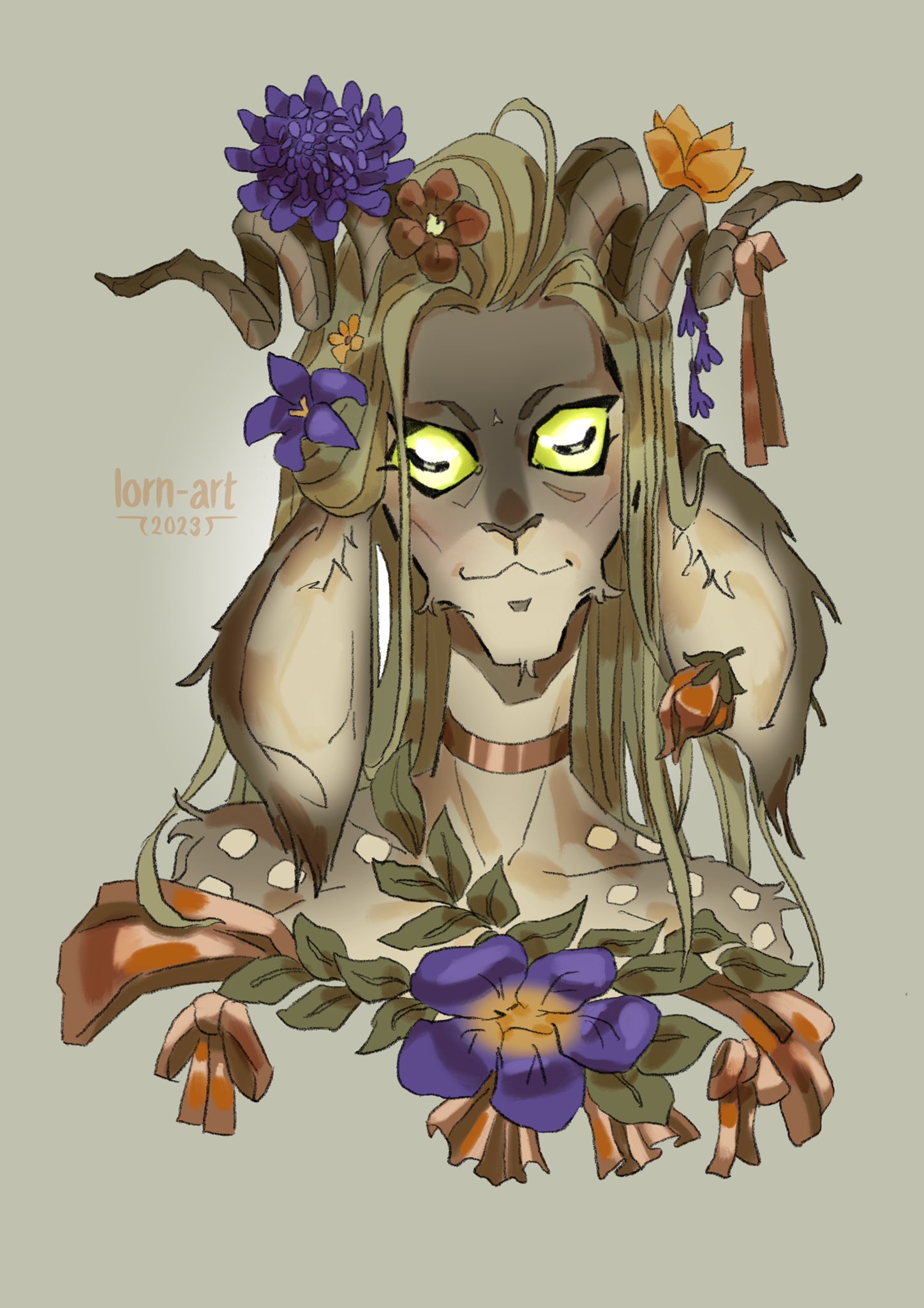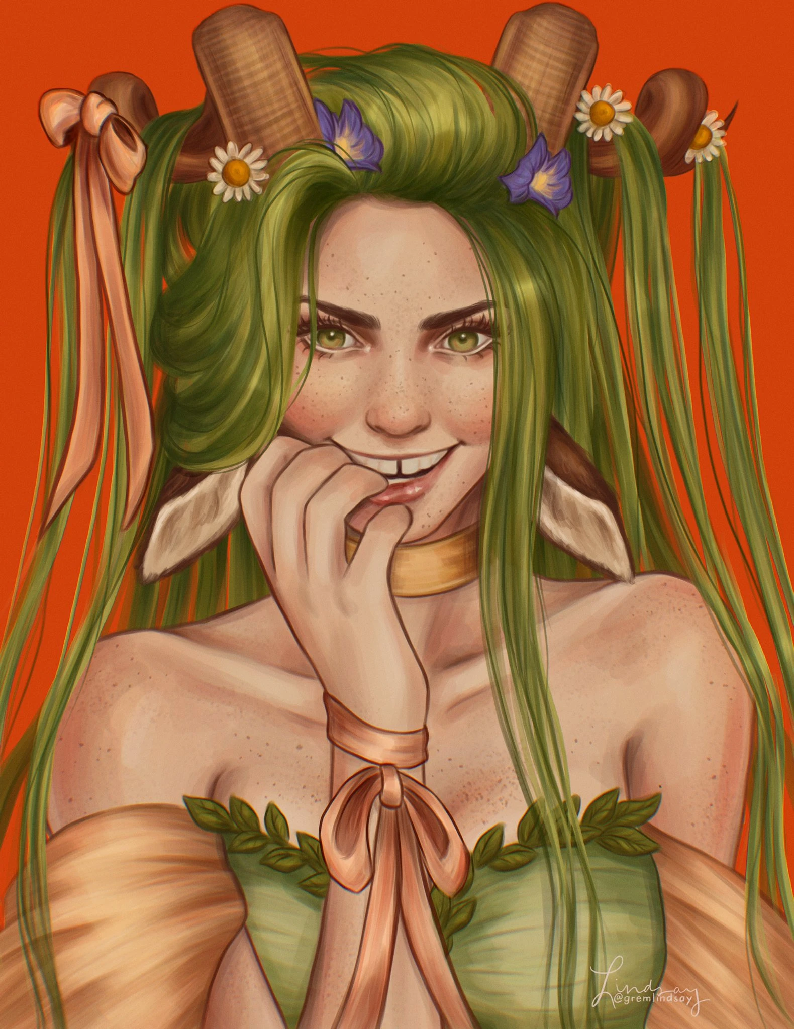 Fearne is a faun. She is a little over six feet tall when measuring from her horns, with white spotted fur, spiraling horns and ample breasts.[39][40][41][42] She has large deep-green eyes (very similar to her mother's),[43] large furry ears,[44] and sea-foam green hair.[45] Her hooves have bits of moss around them. She wears flowy clothing and is covered in poisonous flowers including hemlock and oleander.[46] She has a tail which wiggles when she feels she's being "naughty", although since it's hidden under her clothing it's usually not visible.[47]