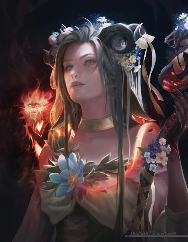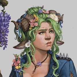 Fearne is unperturbed and direct. Her soft, demure voice contrasts with her somewhat erratic, insensitive, and self-possessed behavior, in much the same way as the wonderful-looking flowers she wears are actually all poisonous. Fearne loves to collect various trinkets,[57] and she enjoys stealing them.[58] In combat, she always goes for the kill.[59] She is flirty by nature, mostly for fun unless there are deeper feelings involved.[60] She can be awkward in dealing with people because of her extremely sheltered upbringing in the Fey Realm.[61] That same isolated upbringing makes Fearne want other creatures to be free, even if deep down she wants them to stay with her.[62]