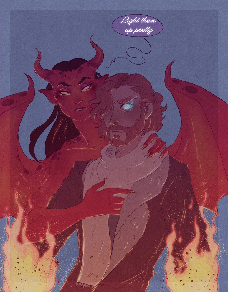 Fan art of a succubus commanding Caleb to immolate his party, by fl0werb0ys.[art 3]
