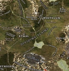 The Foramere Basin is located south of Westruun, north of the Frostweald, and southwest of Kymal. The lake is fed by three rivers: the Byhills River flows from the Cliffkeep Mountains in the northwest, the Tundrun River from the Stormcrest Mountains in the south, and the Wildpath River from the Summit Peaks to the east. After especially hard winters, these rivers run hard and fast, and the overflows spill into Owlset Bay, creating the Foramere Waterway.[1]