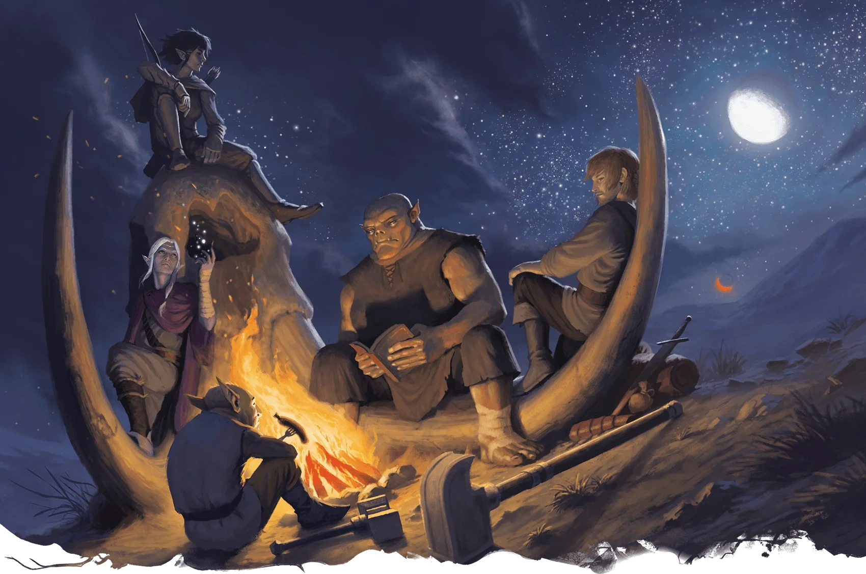 Depiction of Galsariad (left, ground level) and his adventuring party camping while traveling in Xhorhas, by Robson Michel from Critical Role: Call of the Netherdeep, p. 42.[art 4]