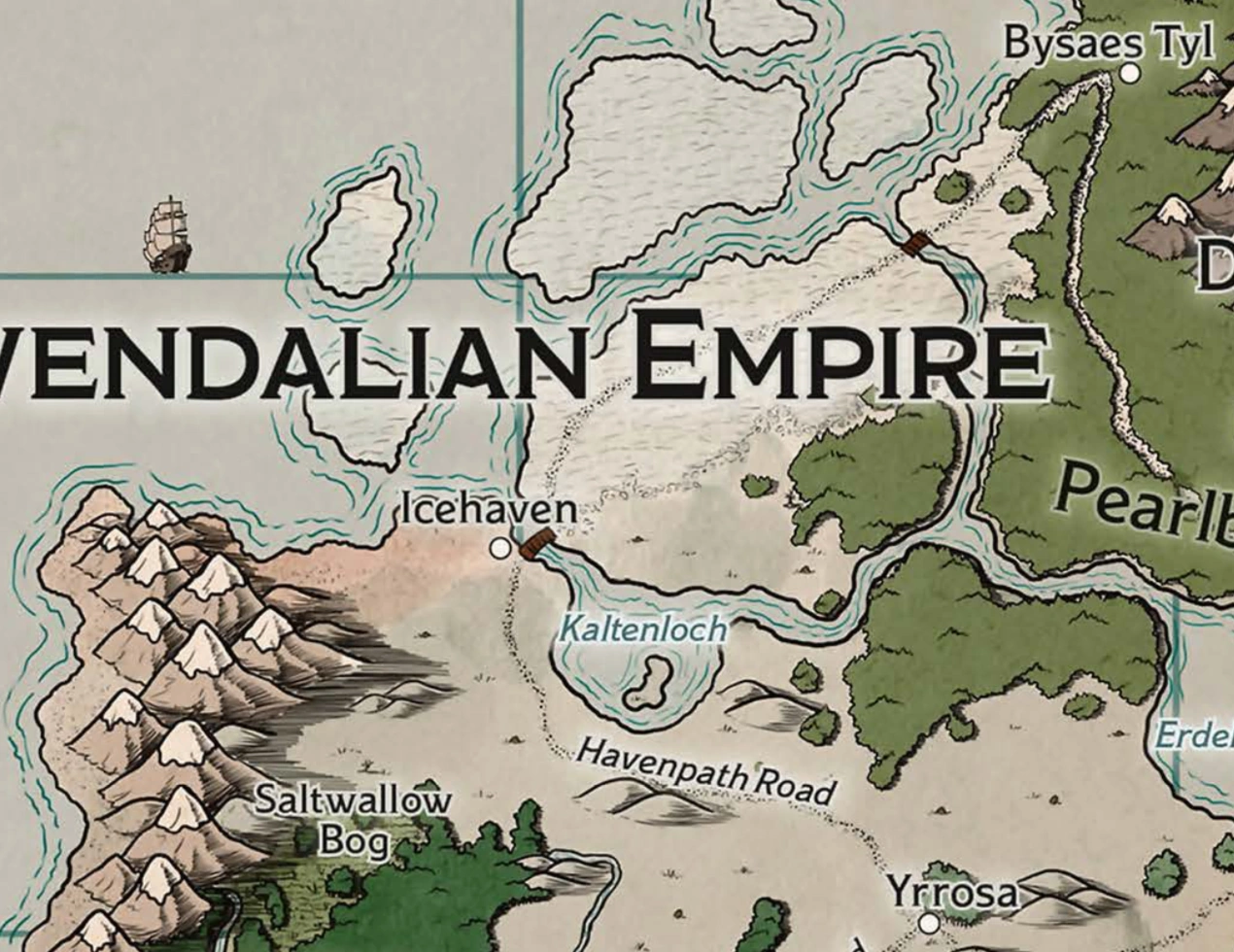 Icehaven is the Dwendalian Empire's only port, although its isolated location and the dangers of the Frigid Depths limit its growth and importance. It is one of the Empire's older towns, established when the Zemni Fields were first settled. It remains a very rough-and-tumble frozen coast town.[3]
