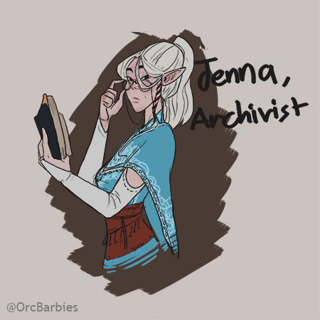 - ↑ Fan art of Archivist Jennah, by OrcBarbies (source). Used with permission.