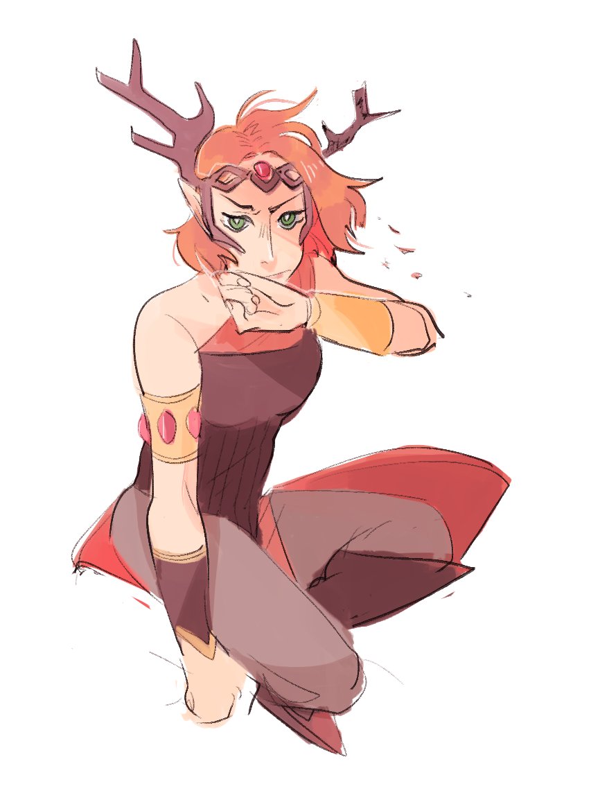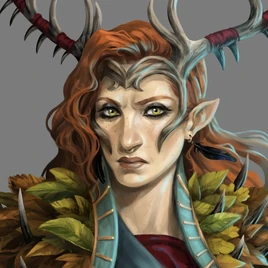 During Campaign One, Keyleth is a twenty-three-year-old young half-elven woman standing about 6' tall,[34] with fair skin, green eyes[35] and long red hair, which was later cut short.[36] She is depicted with freckles on her nose and cheeks in some official material. She's almost never seen without her signature "antlers", a druidic circlet. She would later wear the Mantle of the Tempest, a long cloak made of dark green leathers that unfurl into autumn-colored leaves.