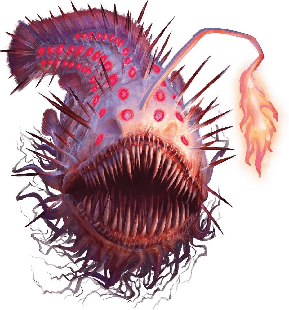 A light devourer is a powerful ambush hunter with merely beast-level intelligence. It searches for prey while hiding in the ocean darkness; one lurked in the dark water 50 feet above the dimly red-lit thermal vents of the Netherdeep, and two others acting as sentries swam in the dark 30 feet above another dimly red-lit chamber at the entrance to the Netherdeep. The creature can absorb both natural and magical sources of light, store the energy in its teeth and its back spines, and then use that energy to burn its prey. Creatures that emit light are thus promising as meals.[1]