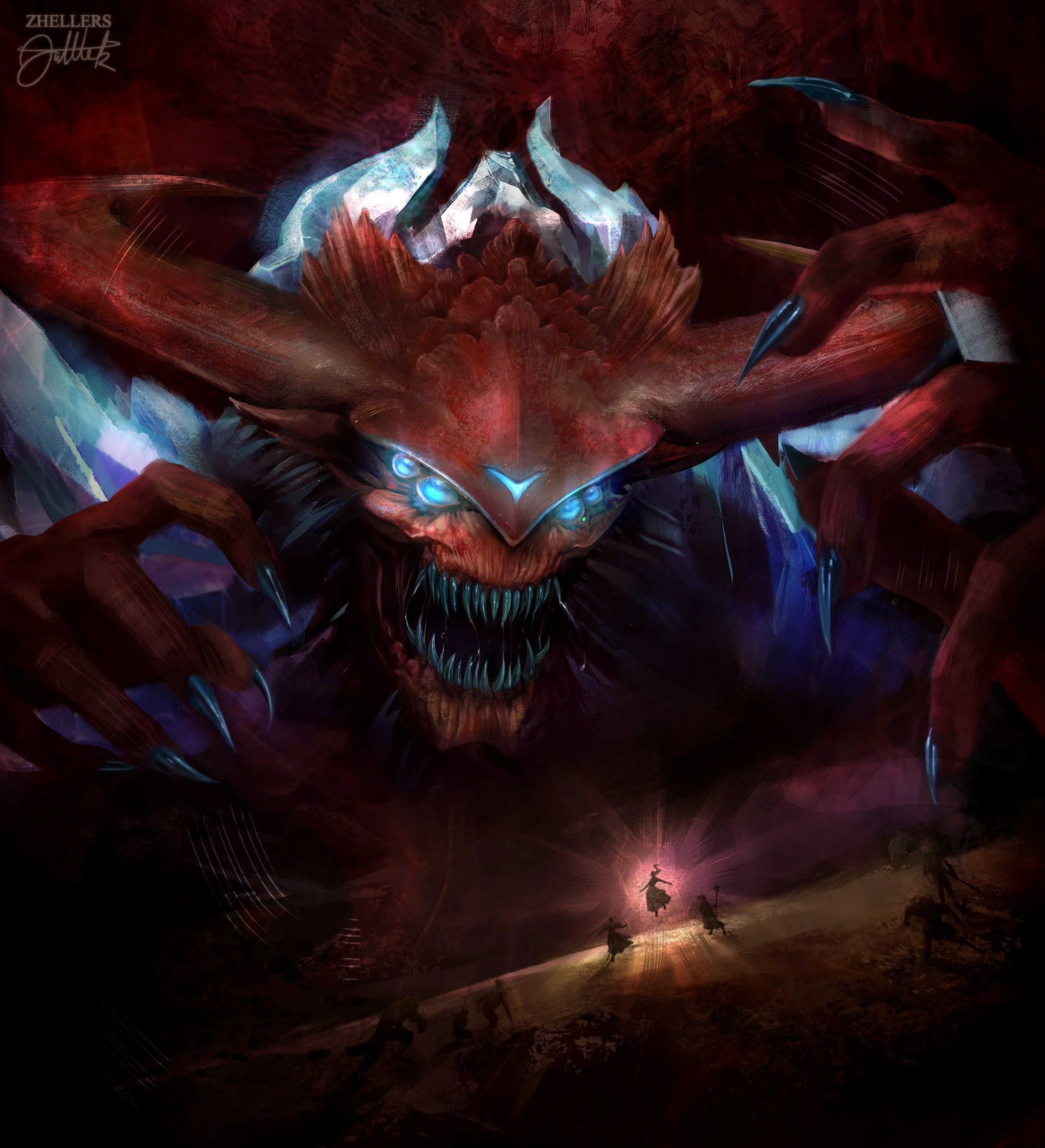 - ↑ Fan art of Predathos and Bells Hells, by @zhellers (source). Used with permission.
