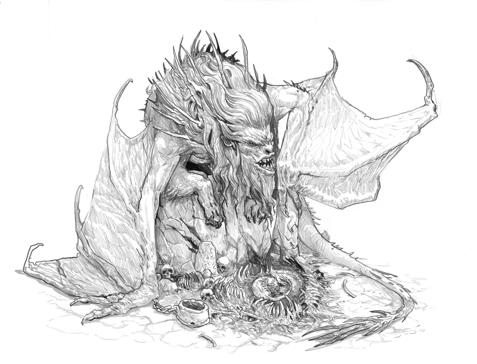 While the manticore was helpless with laughter, the party focused damage on the priest. Caleb struck the killing blow with a Fire Bolt, and the sight of the priest's burning head triggered a flood of memories that made him withdraw into himself. Shakäste landed two final blows on the badly hurt manticore, finally killing it with a bolt of radiant flame down its throat.