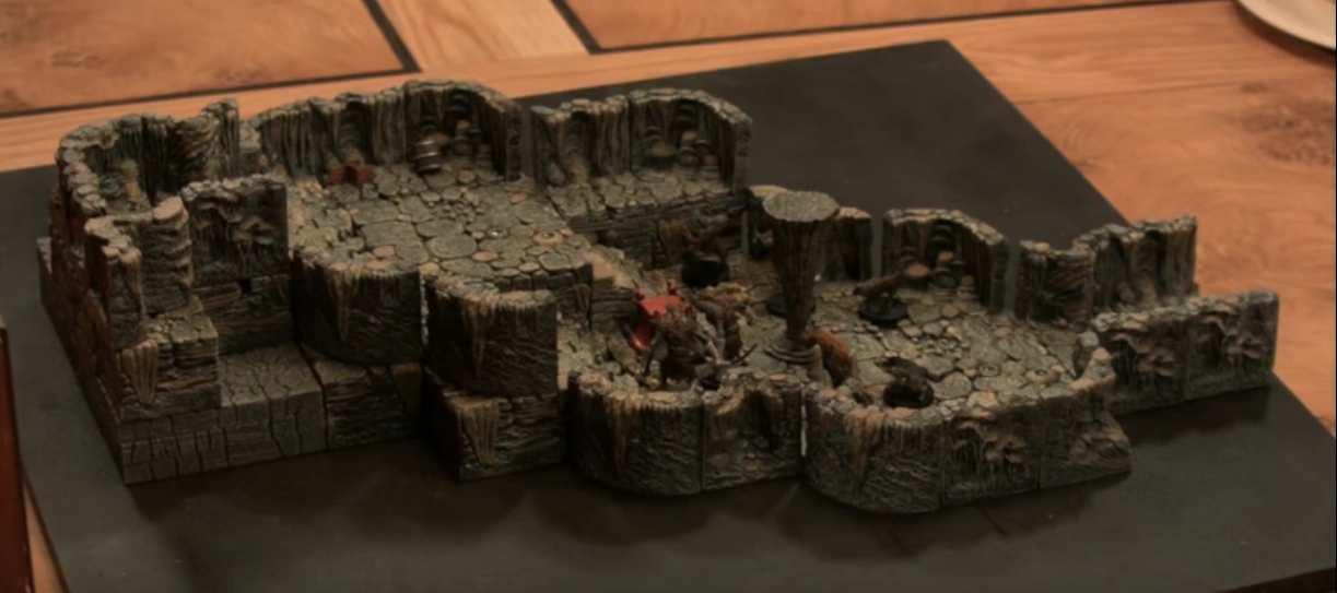The party followed the mineshaft tunnel down towards the woman's voice they had heard. They eventually found a second large chamber containing two hyenas, a skeletal gnoll, and two regular gnolls bickering over a small human child. An explosion from nearby made the group pause before Nott, Fjord, Jester, and Molly initiated an ambush. Just as they were firing off their first attacks, a loud boom shook the interior of the chamber, causing dust and rocks to fall from the ceiling. A cloud of dust and smoke came billowing out of the right passage, followed shortly by a new figure entering the room: the cleric Shakäste, who had also come to help rescue villagers.