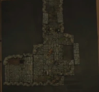 At the time of the cult's occupation, this chamber had a handful of tables, some chairs, sacks of mildewed rice grain, and dry-rotted burlap bags of supplies, strewn about.[8] Additionally, there was an untapped ale and water barrel, a half-full hooded lantern that was partially rusted over, a crowbar, and a slightly rotted sledgehammer. On a small ladder lay a "Boom-Boom Stick"—dynamite.[9]