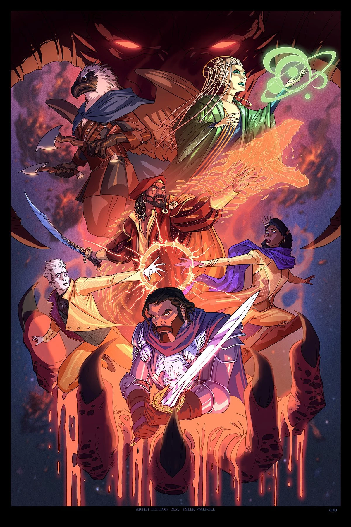Even though the members of the Ring of Brass did not go on adventures like traditional parties, and although they spent a lot of time apart working in their respective professional fields, the collaboration of the six (along with that of their various allies) was crucial in ensuring a chance of Exandria and its inhabitants surviving the Calamity, even if it came at the cost of their lives, their city and their continent, destroyed when Laerryn's Astral Leywright sundered two elemental titans (Ka'Mort and Rau'shan) by shooting them out of the planet. Only Cerrit Agrupnin survived to be reunited with his family.