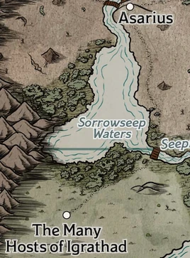 The Sorrowseep Waters are one of two significant lakes (the other being the Fevergulf Lake) in the central wastes of Xhorhas. It is connected to the Emerald Gulch by the Ifolon River, and the Seepfeed River runs through the Vermaloc Wildwood, meeting the Penumbra Range. It is surrounded by a marshland by the same name.[1]