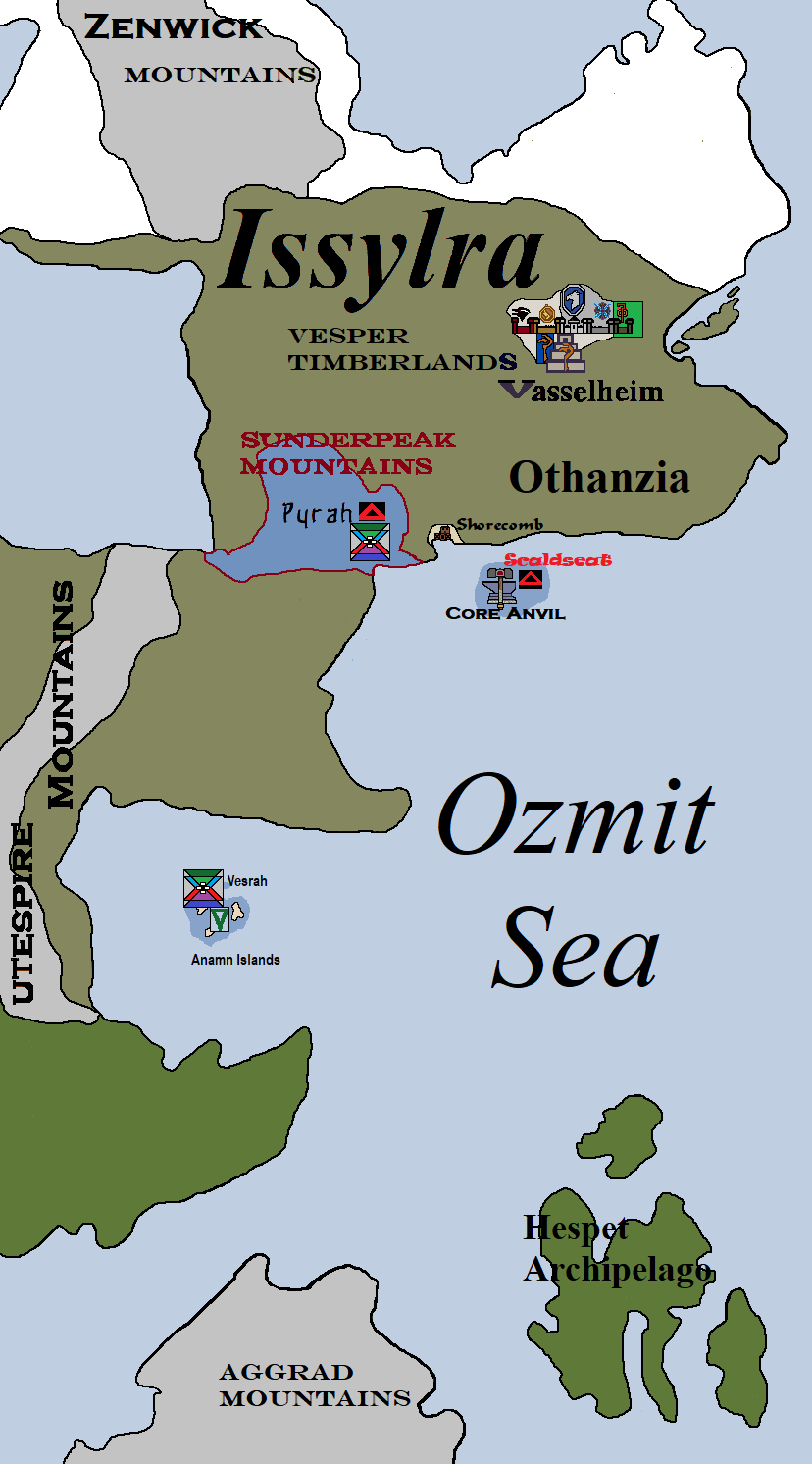 Fan art of a speculative map of Issylra and Marquet, with the Sunderpeak Mountains shaded blue-grey and outlined in dark red, by Aaron Larsen.[art 1] (Note that some locations, such as Vesrah and Shorecomb, are uncertain.)