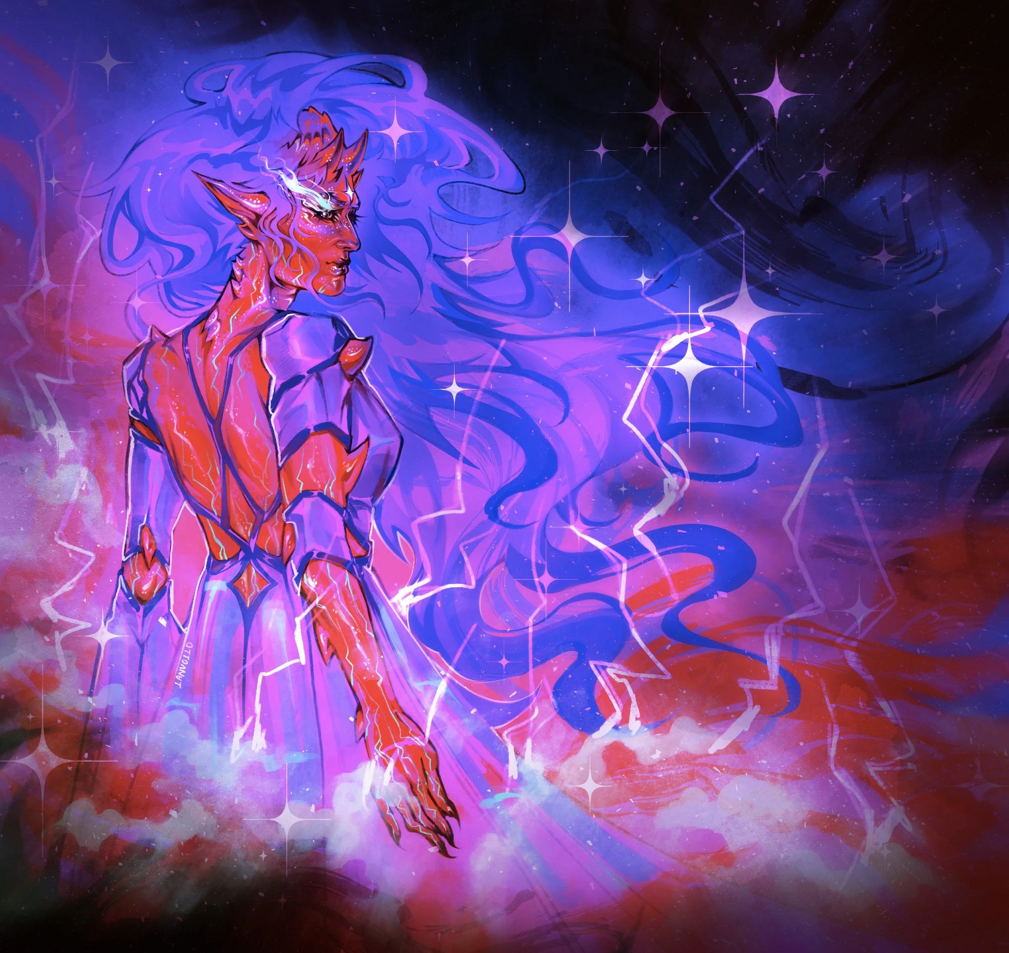 There, you came upon a troop of Exaltant that had surrounded Ludinus, keeping him contained within a psychic shell while he was on the cusp of absorbing the remnants of your mother. You then quickly sprang into action, defeating and dispelling and disrupting the concentration of these Exaltants until one by one, they fell. With the last one crumbling, the shield was absolved and destroyed. A rapid series of actions pulled your mother, Liliana, from the jaws of destruction and ash, and your resident blue bard here immediately locked Ludinus within a dense Forcecage spell.