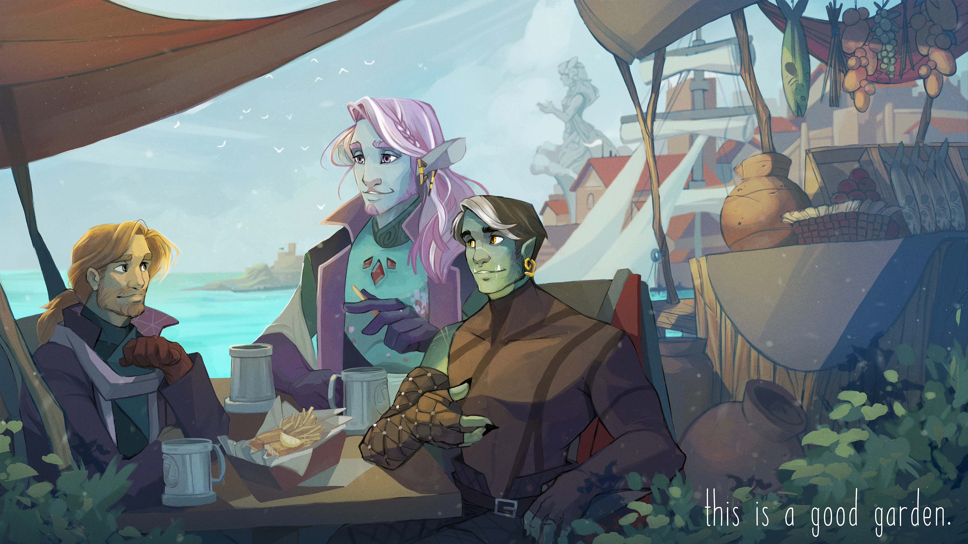 Caduceus: Have you ever planted anything? Put anything in the ground? Caleb: A long time ago, yeah, plants. Caduceus: What did you plant? Caleb: Green beans. Caduceus: Green beans. Perfect. So you put something in the ground. It didn’t look like much. You knew what you were going to get at the end of it. You put this thing in the ground, and it’s going to do what it’s going to do. It doesn’t know what it is. It doesn’t know its purpose. But it’s moving to green beans. The gods plant us, they plant their will and their desire, and we move towards the fruit that we will eventually bear for them, if all goes well. That plant may not have made it. That plant may have fallen to a chill, or circumstance, been eaten by something that didn’t appreciate what put it there. But destiny has planted you here and now, and it hopes that you will bear its fruit. That’s destiny. The tree doesn’t know what it’s going to fruit. You don’t know where you’re headed, but you were put here. And I’ve always known this but I will admit I have never felt it as truly as I have since meeting the rest of you. This is a garden. This is a good garden. A lot of manure. But a good garden.[3]