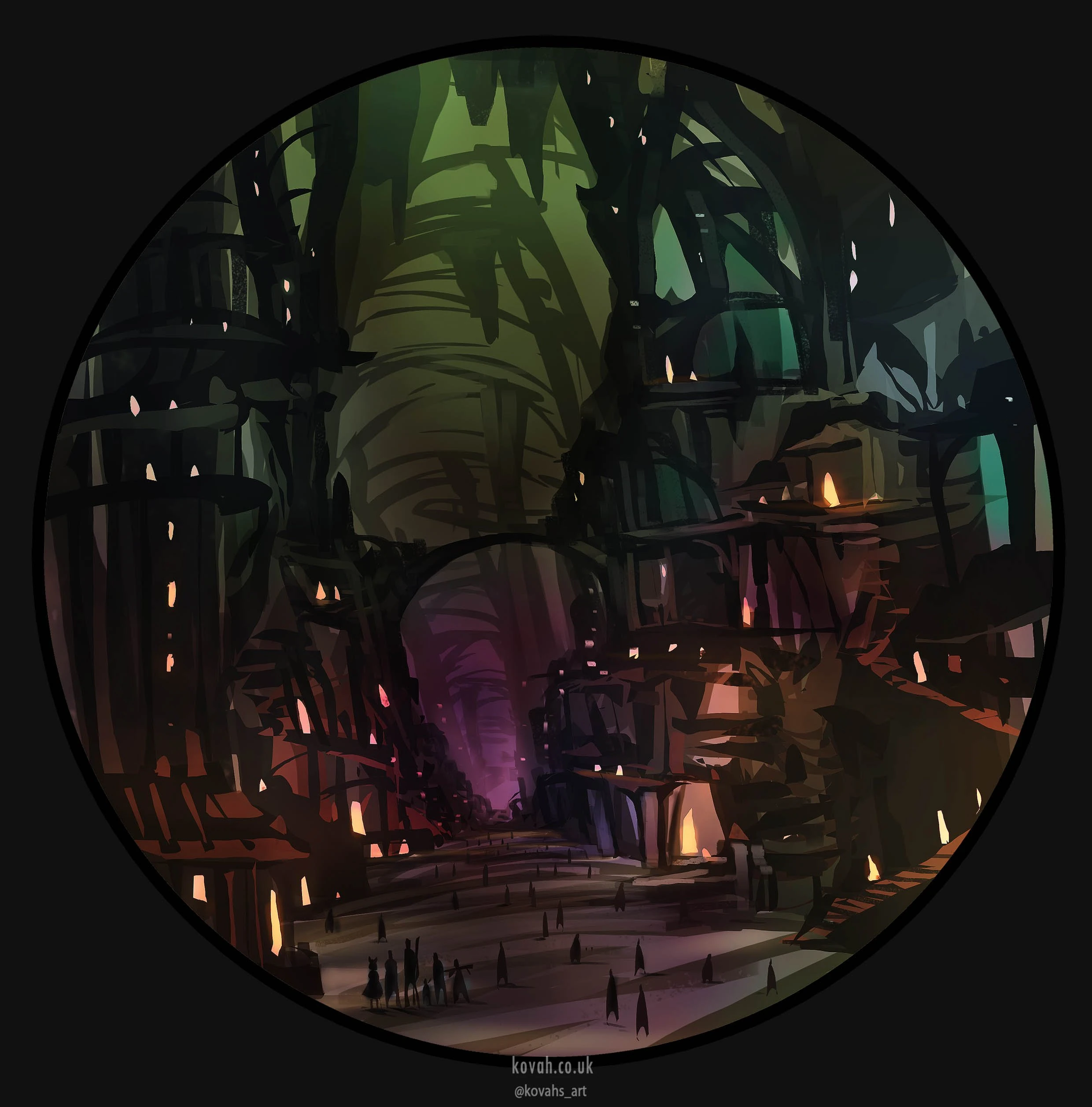 The stairs continue into a very wide opening that leads to a central 30 foot-wide road, the Auger Trail, which is roughly hewn with numerous pillars throughout that rise up to meet the ceiling to both maintain the weight and give it a grandiose, massively scaled grand hall feel. Passing through, it opens up into a massive 120-foot high by 1500-foot wide underground cavern, filled with buildings forming an underground neighborhood that continues to descend, curving like a gargantuan auger slowly spiraling into the earth. There are mining works off to the far right. To the left are other residential buildings in both dwarven and elven styles.[12]