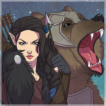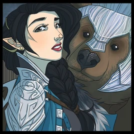 ↑Official art of Vex'ahlia with her bear companion Trinket in 812 PD, by Kit Buss (source). This file is a copyrighted work. Its use in this article is asserted to qualify as fair use of the material under United States copyright law.