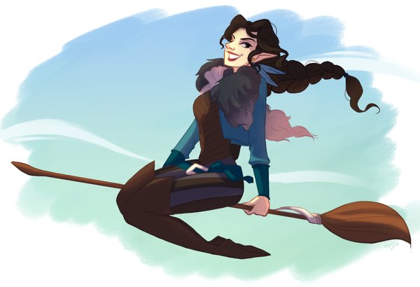 That evening, in Scanlan's mansion, Vex'ahlia attempted to make the broom fly. She requested Scanlan's help, and they discovered the activating phrase: "candle" in Draconic. The next morning, she showed the flying broom to the others, who accused her of stealing it. Vex'ahlia defended herself, claiming she had been meaning to pay Gern for it, but that he left too quickly. She then began to fly above the dinner table and attempted to shoot arrows while flying, which proved to be quite difficult. She asked Percy if he could make improvements to the broom by adding a seat to it, to which he agreed, having already started drafting up plans for it.