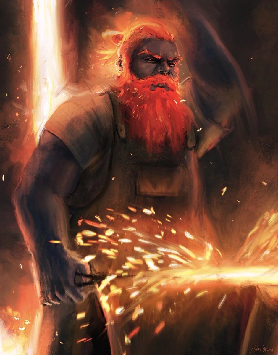 Whaska stands around 16 to 20 feet high and has dark grey ash-like skin, piercing red eyes, and a full red beard singed on the edges. At work, Whaska wears a dark black leather apron[2] and removes it once the work is done.[3] At his first meeting with Vox Machina, he wore metal bracers[4] with a comparably small pouch (the size of Keyleth) affixed to the side of his belt. It contained multiple heavy metal objects, including a small cylinder that was able to detect magic.[5]